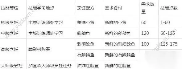烹饪技能是每个玩家都可以学习的专业技能,建议大家都学习,自己根据自己所需要的消耗自己烹饪,感觉挺方便的 PS: 关于烹饪和钓鱼 其实在游戏中,玩家们可以把烹饪和钓鱼看作是休闲的玩法,而钓鱼是搭配烹饪的,因为在料理中,有很多的鱼类菜,比如美味小鱼、美味风蛇、水煮光滑大鱼、大鱼片、蚌肉大餐等等,学钓鱼可以很好地辅助烹饪,而且只要有水域就可以钓鱼,不用再去购买食材,非常方便。