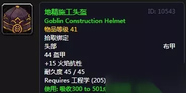魔兽世界怀旧服地精施工头盔 装备效果: 头部 布甲 44护甲 +15火焰抗性 主动:吸收300-501点火焰伤害,持续1分钟