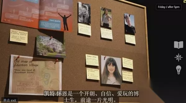 前往Edentown村庄大厅并进行调查。 你会找到一把钥匙。 前往Eden 酒店并进行调查。 你会发现一个未上锁的自行车,一箱旧瓶子和一把螺丝刀。 前往凯特的尸体被发现的森林。 打开你的背包,选择并使用螺丝刀。 你会发现一串破碎的吊坠。 去Eden旅馆找西蒙。 然后马上切换到询问艾玛。 询问艾玛破碎吊坠的事情。 艾玛会告诉你关于自由项链的事情。 向艾玛询问一切关于艾玛和凯特之间的信息。 切换回来询问西蒙。 询问关于那箱旧瓶子的事情并了解到西蒙自酿酒的事情。 向西蒙询问其他事情。 西蒙矛盾1: “只认识凯特3个月。”(Kate Vine的死)X“凯特在大学里戴的项链”(自由项链) 晚上6点(6pm)