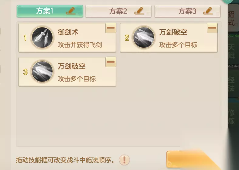 技能自动设置:御剑术[双剑]→万剑破空[增伤]→万剑破空[增伤]。第一回合御剑攒剑(运气好出2把),第二回合满4把剑放万剑破空,配合飞剑高暴击轻松AOE破万;第三回合靠充盈1提供的3把剑,仍有70%万剑破空伤害,通常两回合即可结束战斗。