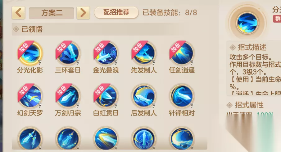 第二回合视血量灵活操作:配合己方阴阳封杀对面物理,或直接针对对方阴阳提速;后续根据场上速度,用金光叠浪(点天赋后攻击无法被保护)或分光化影压尸体,卡速多时优先金光守尸。 方案二:续航输出流 器灵:充盈1+神锋2+长驱15 核心天赋:保留方案一大部分天赋,仅将「三环-追斩」换为「三环-调息」 操作思路: 第一回合同方案一,优先秒宝宝控场。 第二回合若血量健康,且确认自身为物理1速(或队友为1速),可放心用三环攻击对面人物/宠物,确保击杀触发调息效果,第三回合持续输出。 PK小贴士:建议单独准备一套主属性为速度的器灵,前期物理1速优先级极高,舍身剑伤害达标即可。 二、技能搭配:实战灵活切换