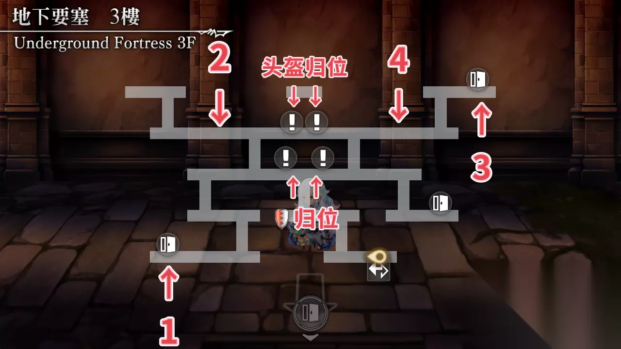 1:开闸 2:拿头盔 3:跑到3号房间门口挂头盔 进门开宝箱 4-5:开始解谜(左房间:桌子→枪架←椅子↑桶↑ 右房间:枪架→桌子←桶↑椅子↑) 6:进门拉闸→到对面触发剧情