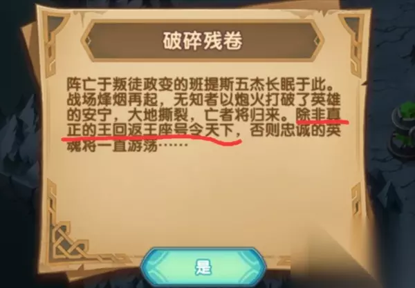 主要的提示语就是划红线的位置,王者归来,刚开始以为炮火也是一个关键,不能开炮才会出现奖励,试验这并不是,王者才是关键,王者就两个一个亚瑟,一个骨王,亡灵为主,所以就是骨王,只要27下面参战的有骨王就可以拿到隐藏奖励。