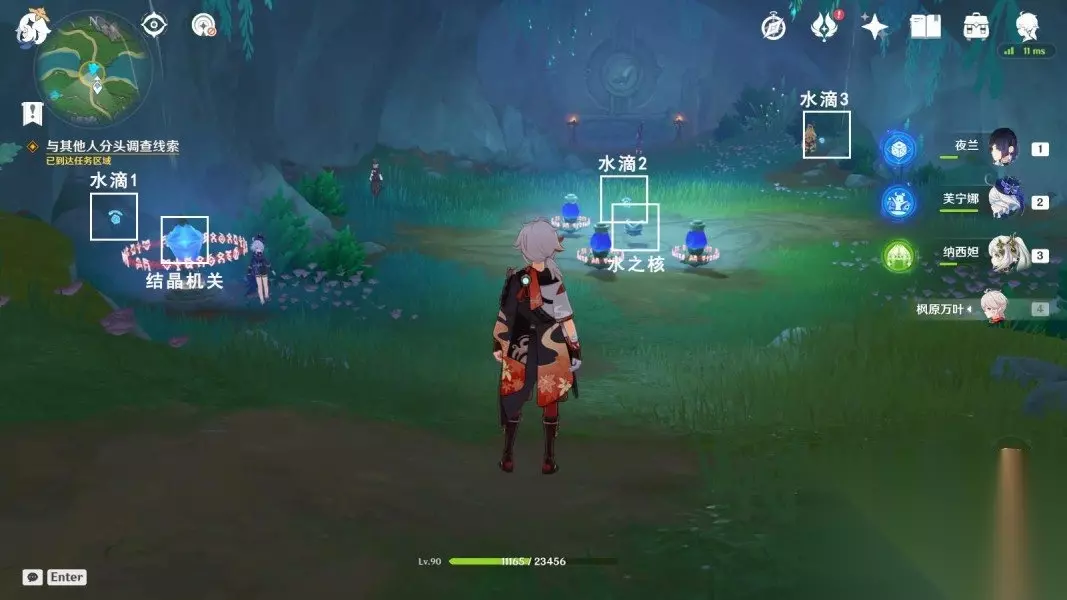5、与其他人分头调查线索 按下列步骤解谜: 1、拿起水滴1-3,将水之核放在底座上。 2、等待芙宁娜/娜维娅/林尼找到隐藏的3个侦测晶体。 3、当6个侦测晶体中间会聚时,解锁结晶机制。 4、攻击结晶机制一次(蓝灰色),等待。