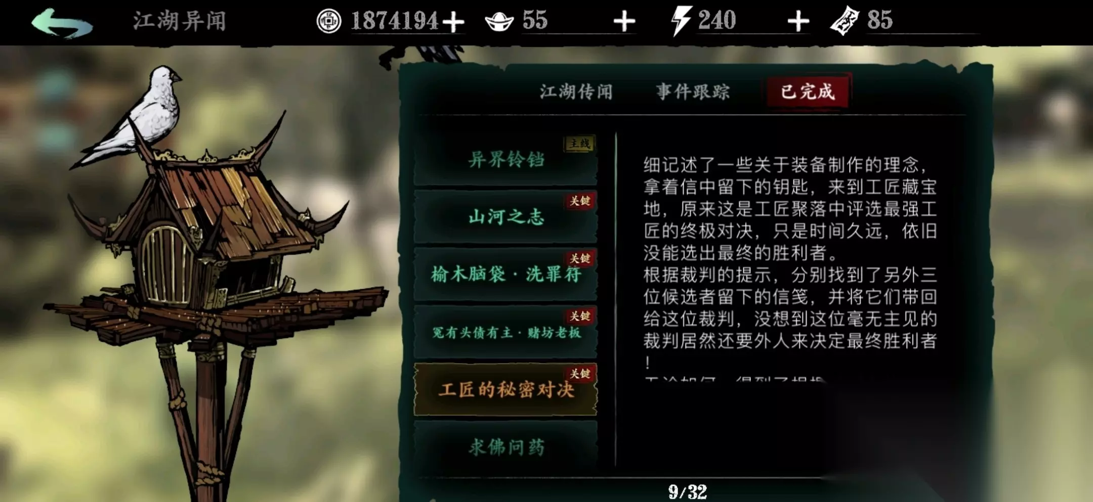 工匠的秘密对决是一个重要的支线任务,完成任务可获得600元宝和金装图纸奖励。该任务需要玩家完成灭法司的残酷美学获取药房钥匙,然后在药房找到评委,接着前往石窟密道寻找高手,再到沉沦谷和无眠街获取遗书道具。任务最后需要在狂、魔、巧、御四个选项中选择一个,每个选项对应不同的属性加成。