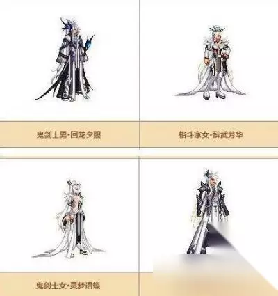 具体的外观如图: 1、鬼剑士男·回龙夕照、鬼剑士女·灵梦语蝶。 2、格斗家男·潜龙升天、格斗家女·醉武芳华。