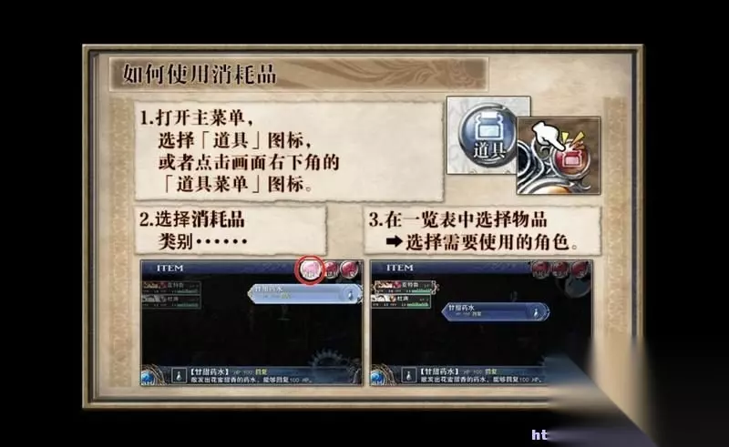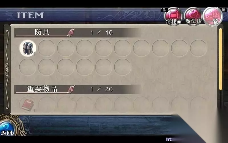 初期需要及时了解物品道具界面。 本界面分为消耗品、魔法具和一览三个项目。 前两个项目对应相应的道具存储,玩家可以使用和调整。