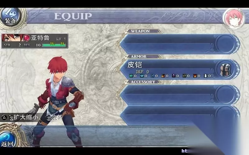 然后是装备界面,这里可以点击装备武器和防具。 另外亚特鲁还可以装备两个不同功能的饰品。