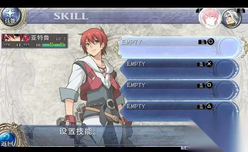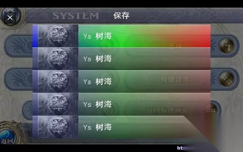 按开始键可以调出主菜单,分为八个项目。 装备:人物的武器、防具等装备情况。 技能:本作技能也像装备一样可以装卸,总共可以使用4个特殊技能。 道具:各类冒险道具,有道具一览表。 系统:存取当、按键等系统设置。 编成:本作加入了多个角色可以操控,这个项目可以编辑人物切换顺序。 冒险日志:相当于任务记录。 记忆:亚特鲁的记忆碎片,本作就是逐步找回记忆的过程。 地图:塞尔塞塔的树海地区的探索地图,标注了探索到的采集点。