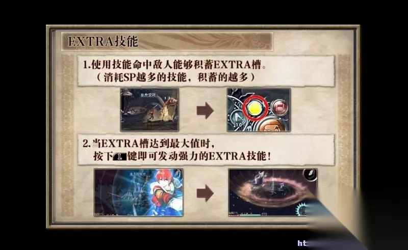注意图中圆轮状的技能栏,内圈四个栏位为装备的技能。 外圈为SP积累情况,积累一个叶片的能量就能施放一次技能。 按住R键的同时按住任意四个基本按钮就能发动对应的特技。