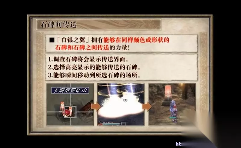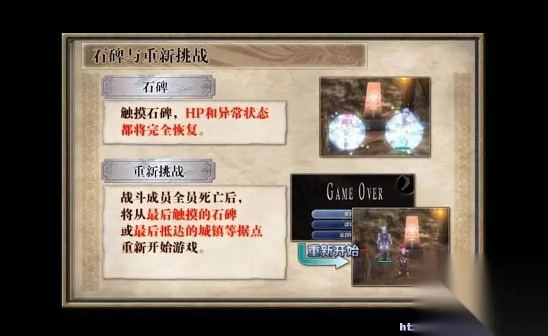 冒险过程中会遇到各处的石碑。 石碑可以恢复生命和异常状态,全灭后也从最后一个石碑重开。 玩家还可以借由石碑进行快速传送。