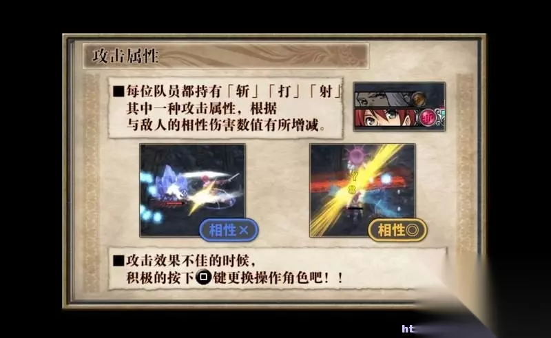 战斗中,还存在一个攻击属性的问题。 每位队员都对应斩、打、射三个攻击属性中的一个。 敌人也会有某类攻击属性易伤的效果。