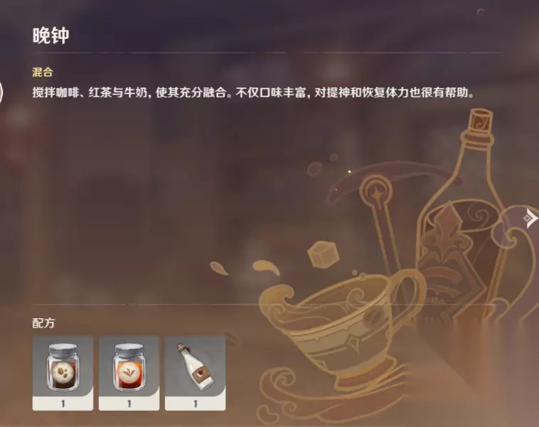 原神曲生酌微梦晚钟怎么调 【晚钟】 咖啡 红茶 牛奶(混谷 搅拌咖啡、红茶与牛奶,使其充分融合。不仅口味丰富,对提神和恢复体力也很有帮助。)