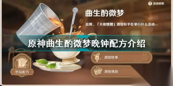 原神曲生酌微梦晚钟怎么调?原神曲生酌微梦活动已经开启,在活动中,玩家可以选择不同的基底来进行调配,晚钟就是属于混合类的一个饮品,下面就由小编给大家带来原神曲生酌微梦晚钟配方介绍,希望能给大家带来帮助。