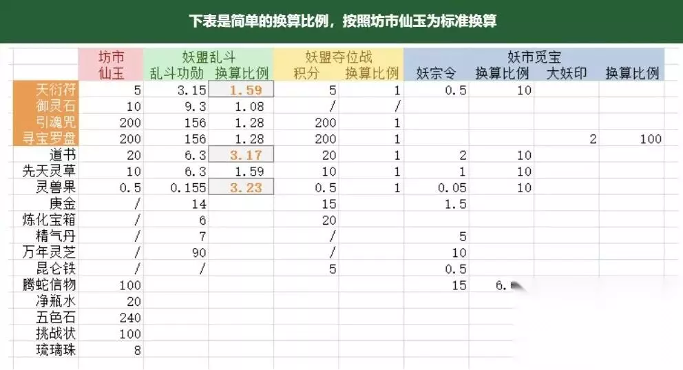 一、妖盟乱斗 乱斗商店按照换算比例,最划算的商品依次为:灵兽果>道书>天衍符>引魂咒(召唤令)=寻宝罗盘>御灵石,玩家可以根据需要兑换。 建议优先换取道书将仙友都提升到60,再换取其他,灵兽果因为需求量巨大,可根据自身需要换取,零氪或者微氪建议换取天衍符。 此外,乱斗活动除常规物品外,还可以换取橙色自选灵兽和橙色自选精怪,需要乱斗积分3700解锁,道友如果不打算冲击排名,可以通过屯乱斗挑战令,两周可以换取一次。 二、妖盟夺位战 换算比例:天衍符=引魂咒(召唤令)=寻宝罗盘=其他。 可以看到,妖盟荣誉商店和坊市换算比例是一样的,但不能换取御灵石; 此外,荣誉商店可以换取橙色自选精怪碎片和橙色法宝碎片,但每周有限购次数,玩家可以优先换取这些,剩下的可以换取灵草、灵兽果等; 三、妖市觅宝 分为妖宗令和大妖印2种物品,大妖印所换取的都是特殊物品; 只能换取天衍符和寻宝罗盘,但寻宝罗盘需要高等级物品大妖印换取,其换算比例也和坊市基本一样。 此外,妖宗令可以换取紫色法宝,笔者个人建议换取天衍符。 以上就是233乐园小编整理带来的寻道大千商店物品兑换攻略分享,更多精彩内容,请点击关注233乐园!