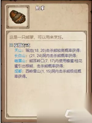 烟雨江湖熊掌怎么获取: 获取方法: 1、首先我们前往成都西岭雪山,用轻功跳上去,子时水流会冻住,刨开雪可以进洞,里面有一只80级熊,我们只需要击杀它就能获得熊掌了,要是你的实力不够不要轻易的挑战。 2、天山:瑶池(18,20)击杀熊较高概率获得。 3、长白山:(21,24)洞内击杀熊概率获得。 4、峨眉山:能耳岭口(7.17)内使用蜂蜜/桂花蜜引出棕能,击杀能概率获得。 5、成都:西岭雪山(1,15)洞内击杀能极低概率获得。