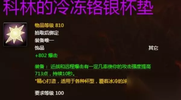 千年腌蛋 物品的等级为810,使用后可以在治疗时有概率提高速度,持续时间为10秒。 科林的冷冻铬银杯垫 物品的等级为810,装备后在造成远程攻击的时候有几率提高伤害强度。