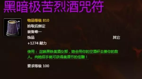 【相关推荐:潘达利亚护火者成就攻略】 魔兽世界科林烈酒掉落奖励什么 黑暗极苦烈酒咒符 物品的等级为810,是一件饰品,使用后可以召唤一位用空酒杯攻击敌人的美女。