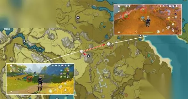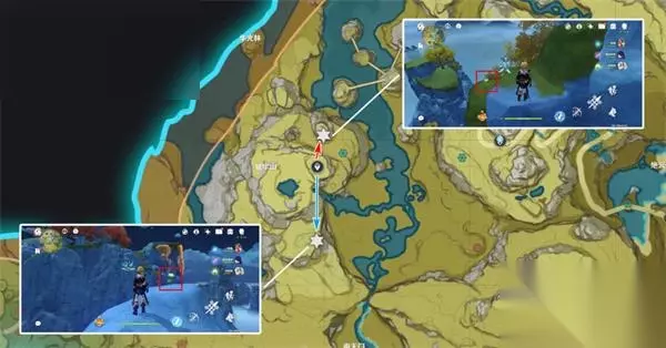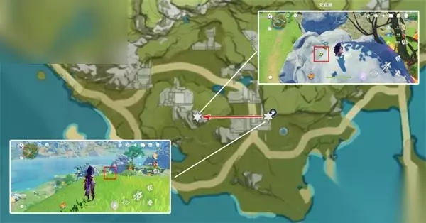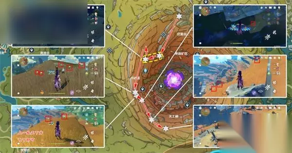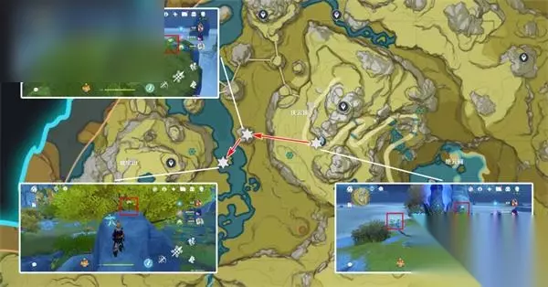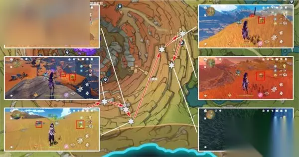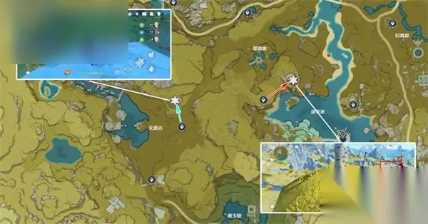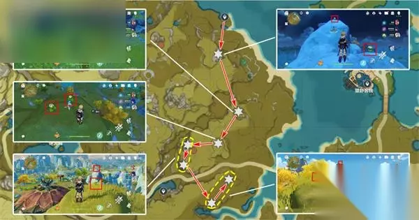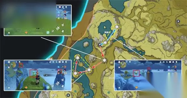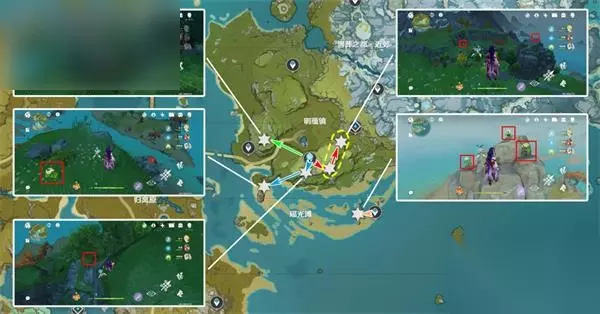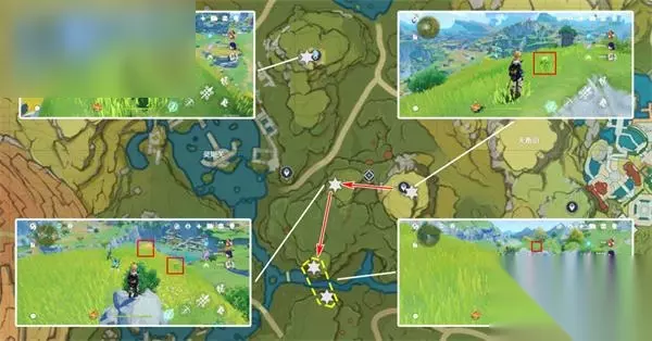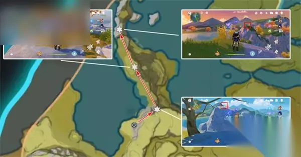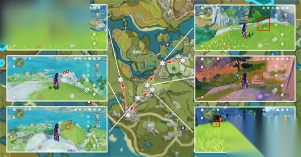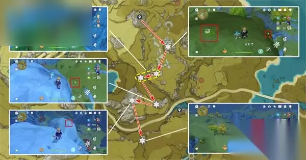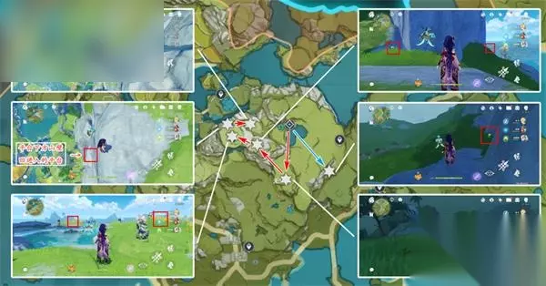 清心数量:9个,继续沿着上个路线前进,需要注意右中和右下两个采集点分别位于同一座山的山脚和山顶。