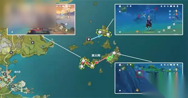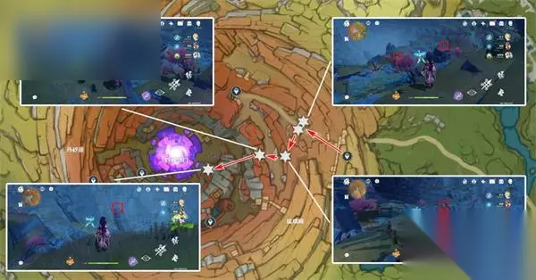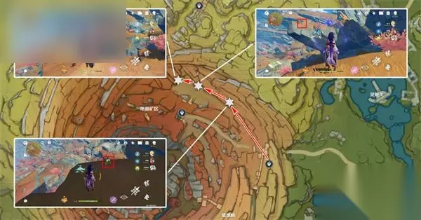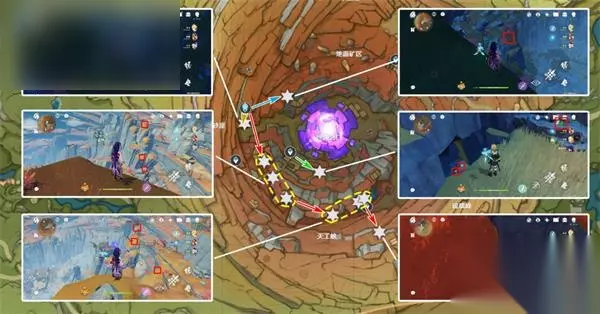 环层岩巨渊路线 清心数量:9个,请注意图片上观察采集点的位置,点位于山的中部凸起的平台上,其他采集点都位于石柱的顶部。
