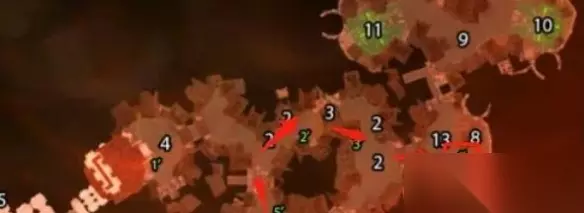 3、进来之后从图中的箭头方向绕弯一直向右边走,走到右下角的4号位置。
