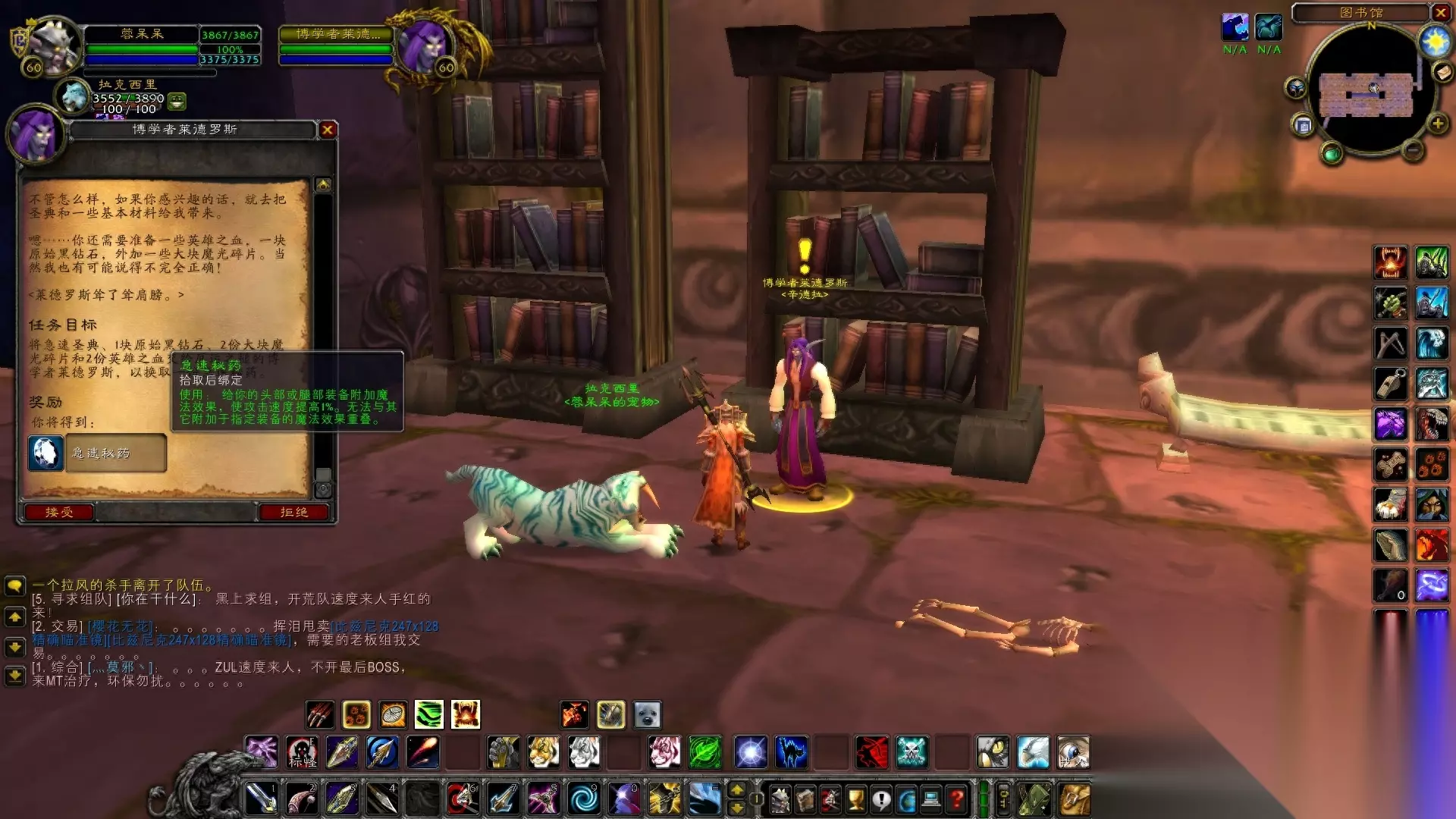 2.在图书馆中间靠墙处找到博学者莱德罗斯。和他对话,可以接到急速圣典、专注圣典、防护圣典三个任务,分别奖励急速秘药、专注秘药、防护秘药。 (友情提示:就算你把辛德拉声望冲到了崇拜,他也只提供这三种秘药;辛德拉声望没有军需官。)