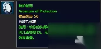 3. 防护秘药 使用:给你的头部或腿部装备附加魔法效果,使躲闪几率提高1%。无法与其它附加于指定装备的魔法效果重叠。这个秘药无疑是MT的最爱。