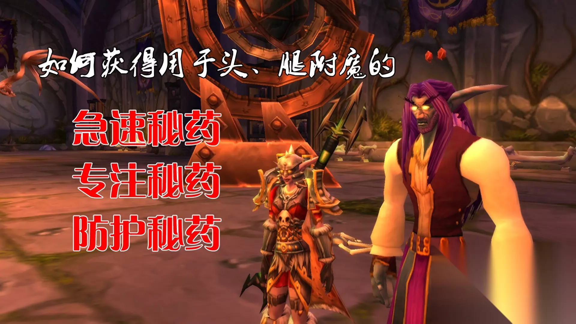 在祖尔格拉布上线之前,魔兽世界怀旧服在头、腿附魔上,共有八种秘药可供选择。其中有三种位于厄运之槌北部副本中,分别是急速秘药、专注秘药、防护秘药。下面,请跟我一道来看看这三种附魔秘药都有什么效果,该如何获得。 一、三种附魔秘药的效果 1. 急速秘药 使用后给你的头部或腿部装备附加魔法效果,使攻击速度提高1%。无法与其它附加于指定装备的魔法效果重叠。这个秘药特别适合以攻速取胜的近战DPS。