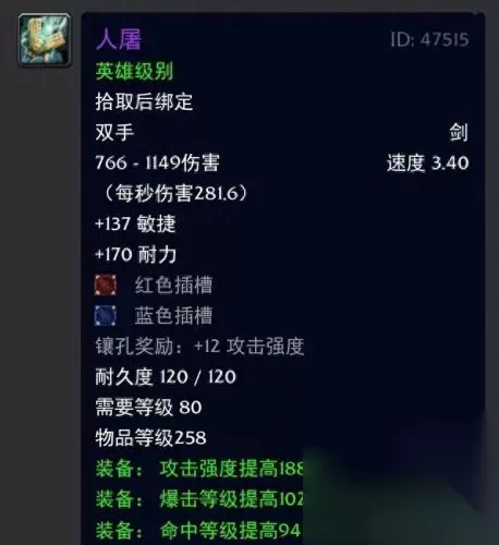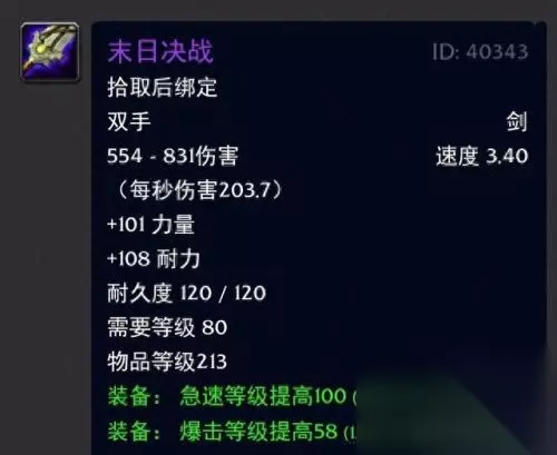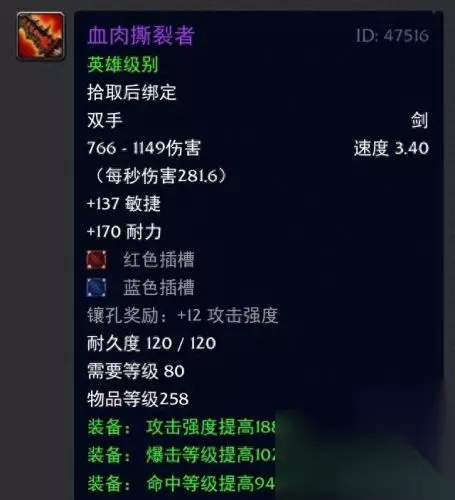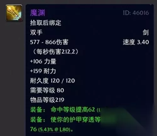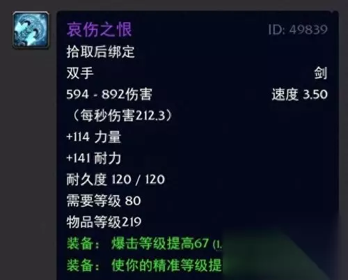 两者数据面板一模一样,只不过是联盟和部落区分了名字罢了! 不过就造型而言的话部落方的鲜红果断是略胜一筹啊,属性方面来说的话还是非常可以的,毕竟带爆击命中还送双插槽的双手剑可不多见哦,攻强也是可以,而且国服TOC的开放也是提早了,所以当年的玩家可以说是乐此不疲的肝这个效率装备又不错的团本,简直是喵叔我的美好回忆杀啊。 三:哀伤之恨;映像大厅出品