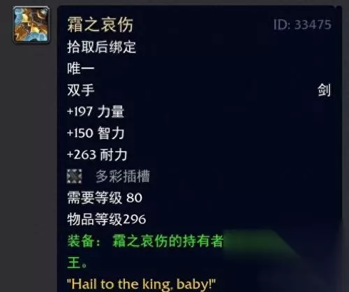 可能你对上述的四款都不太熟悉了,那么对于这款堪称魔兽世界历史上模型最大的双手剑你应该不会陌生吧! 无数幻化党玩家为之痴迷,当年喵叔第一眼看到有玩家幻化他的时候就被勾走了魂魄一般久久不能自拔,赶紧思索一番此外来自何方果断去肝了! 那么话说回来,你曾经是否拥有过呢? 好的,那么本期喵叔有关于WLK团本冰冠堡垒BUG级饰品TOP5的分享也就到这里,如果你还有何更好的见解亦或者遗漏的话也欢迎评论区留言与喵叔分享,喵叔届时也会为你疯狂点赞哦! PS:也希望大家能够在现如今快餐化时代的游戏大环境中不忘初心,能够重拾自己当年的那份魔兽情怀! 魔兽世界,我们的另一个世界!