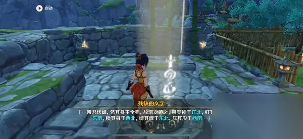 2、在坐标处启程圈套,获取文字提醒“帝君伏螭,然其身不全死,故渐次镇之,束其神于正北,钉其骨于东南,锁其身于西北,缚其魂于东北”;