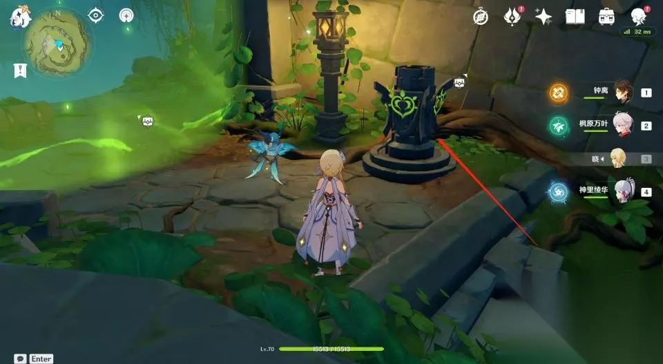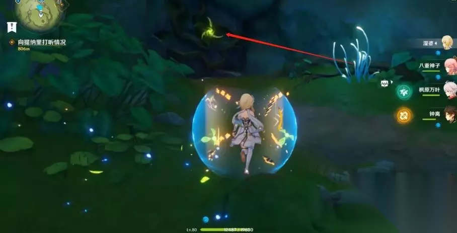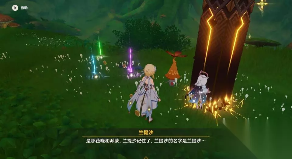 9、仙灵会带着玩家来到一个绿色屏障前,等待仙灵钻入地下后屏障前的草方碑会解锁,使用草元素攻击激活草方碑。