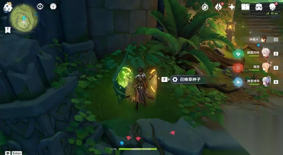 6、召唤草种子后看向西北方向,使用重击攻击西北方向带有绿色光点的石头,让草种子击碎石头。