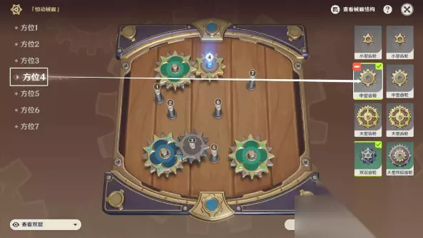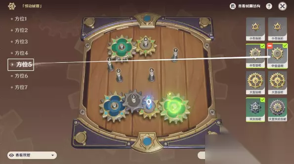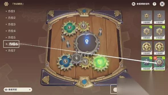 >>小编推荐:恒动械画全关卡通关攻略<< 在第六天,我们将完成最后一块“械画部件”的复原和“恒动械画”的拼接,第六天需要在五个方位上放置齿轮,难度上与第五天大致相近。同样的,第六天的解谜解法也不唯一,两种齿轮摆放攻略与结果展示如下: 方位三