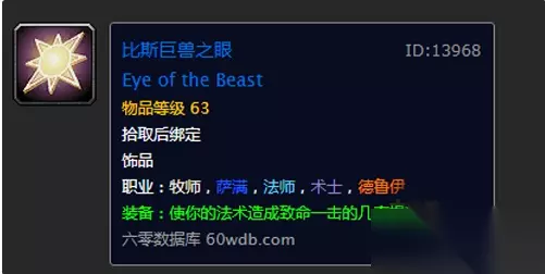 比斯巨兽之眼介绍 物品等级: 60 拾取后绑定 饰品 装备:使你的法术造成致命一击的几率提高2% 职业:牧师 萨满祭司 法师 术士 德鲁伊 以上是小编带来的全部回答,更多精彩资讯,请继续关注233乐园!