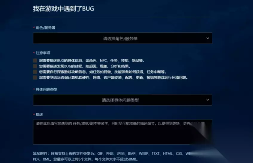 选择“游戏问题”→勾选【我在游戏中遇到了BUG】 在“详细描述”中注明:“物品名称+丢失时间+具体场景” 4. 证据材料准备 需注意以下关键附件: