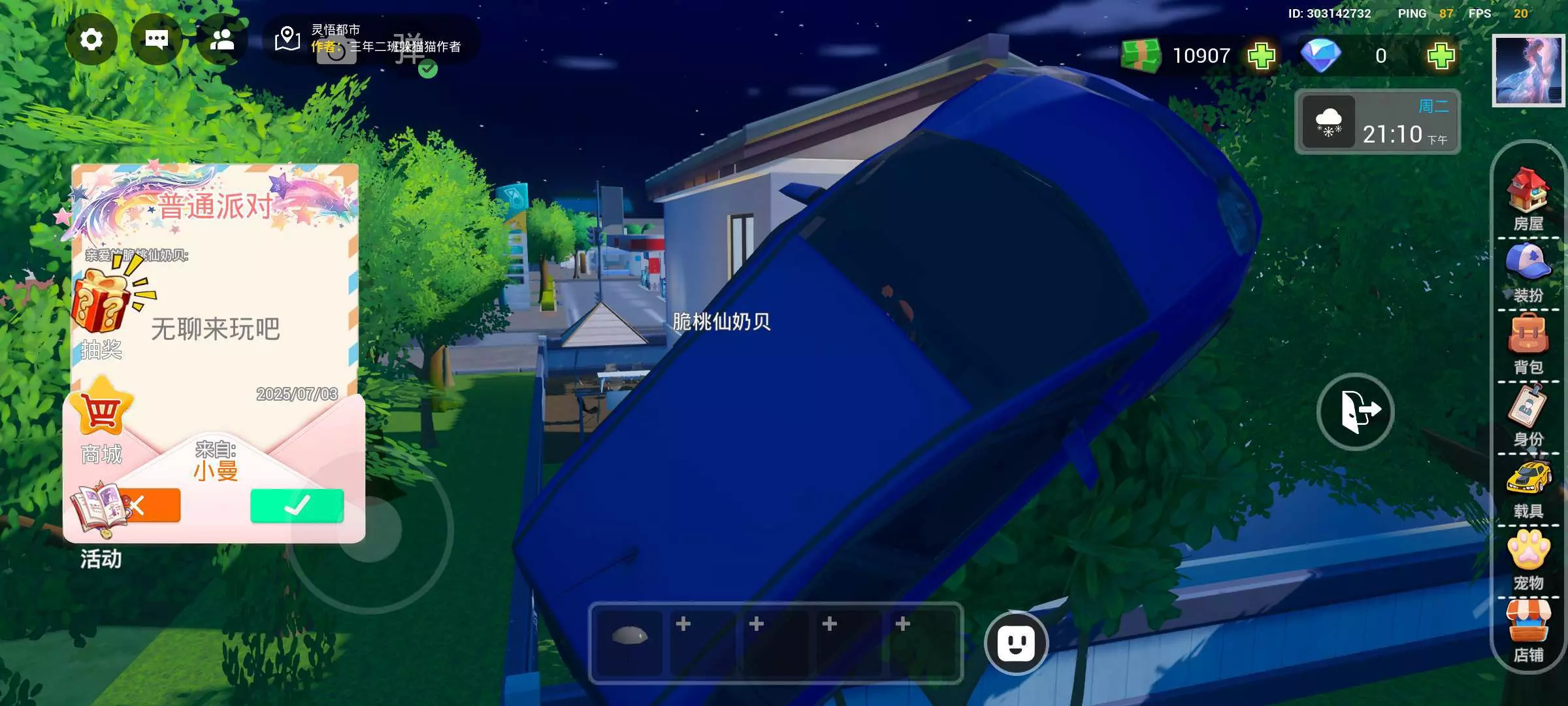 今天我去“旅游”。刚开始我正开车,开的太快,撞到了路灯,飞了起来,飞到了围墙上。看到大海后发现我居然可以出图,后来把这个围墙绕了一圈看着玩家们一举一动。然后开着车下去掉进了别人房子的树上。最后房子主人退了,我掉进了虚空,复位。《完结》