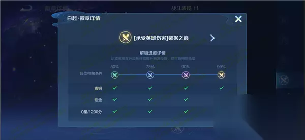 八、职业徽章系统 1、玩家使用英雄可以解锁不同类型的职业徽章,结算-英雄-职业徽章页面将显示该局获得的职业徽章,点击查看获取条件和细节。