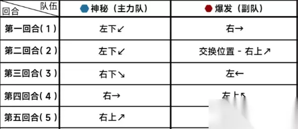 三、队伍选择:神秘主力队、爆发副队。 四、详细战斗: 主力队(神秘): 第一回合(1),左下。 第二回合(2),左下。 第三回合(3),右下。 第四回合(4),右。 第五回合(5),右上。 副队(爆发): 第一回合(1),右。 第二回合(2),交换位置-右上。 第三回合(3),左。 第四回合(4),左上。 第五回合(5),左。