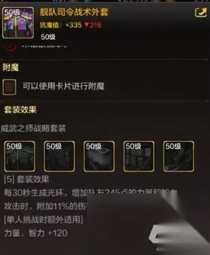 3、指挥官5件:该套装辅助能力是最强的,但是因为是皮甲的原因,因此自身抗魔值会低一些。