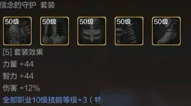 2、 防具 防具有三种选择: 1、深渊刷取信念的守护套装:该套装效果加强10级技能等级+3,由于勇气祝福是我们的核心BUFF技能,并且也是10级的技能,所以选取该套装作为圣职者的毕业套装,同时兼顾了奶量和输出。