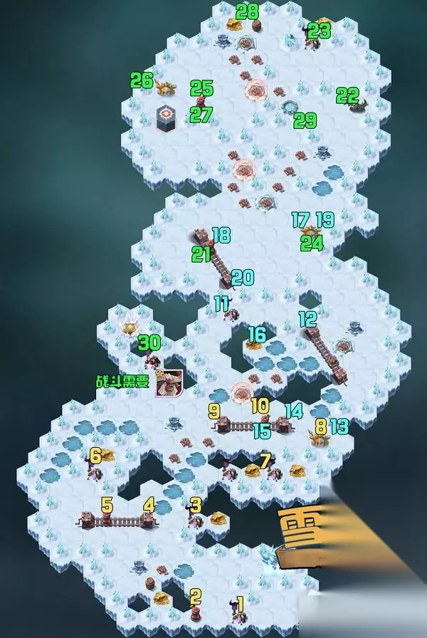 剑与远征雪与火通关攻略大全 1、新奇境漫游雪与火将于北京时间 2022/06/18 08:00开启。 2、玩家通关关卡33-20且奇境漫游副本“心之囚笼”进度达成60%后即可解锁。 3、不知道怎么走的可以参考上图的顺序,按照数字去走就可以了。