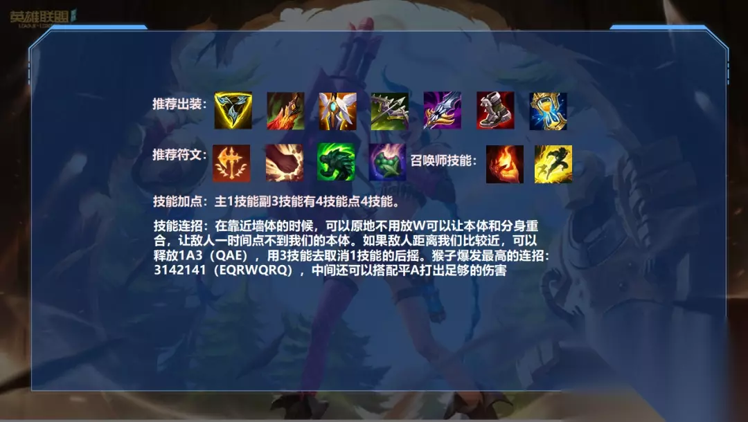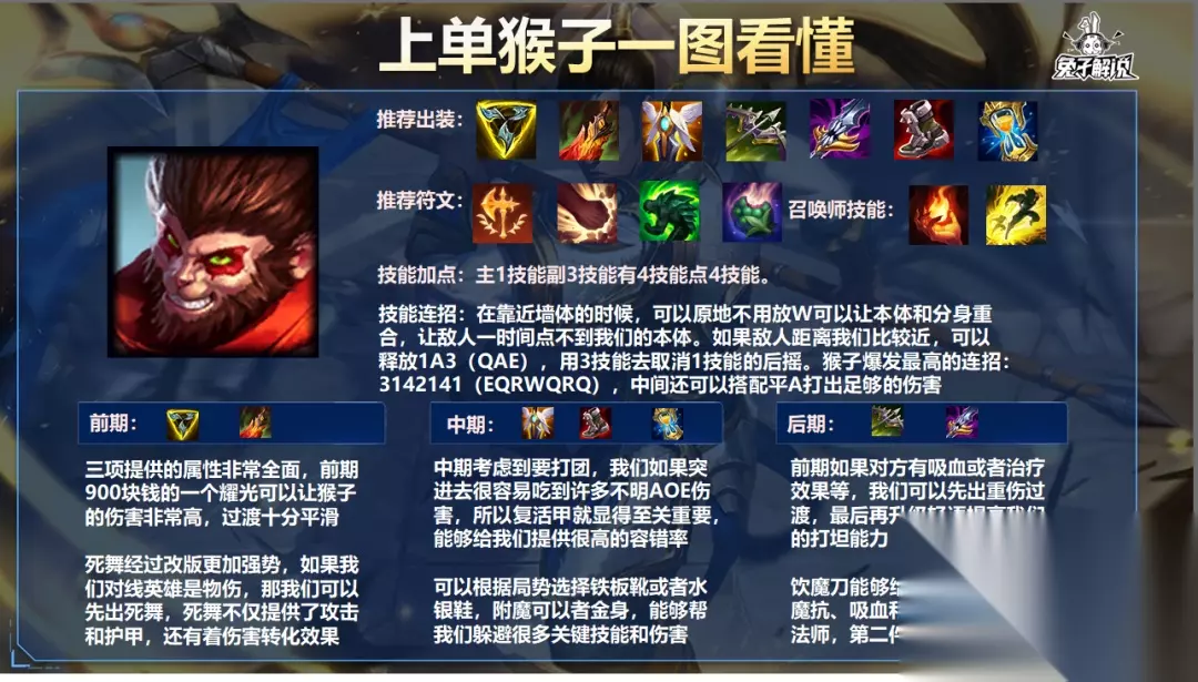 出装方面: 三品猴的爆发力非常高。制作出三件猴子后,我们可以使用我们的不明连击轻松杀死3/2 HP 的目标。如果目标不是很肉的话,我们甚至可以满血杀死它,但是我们也比较脆,能躲的技能就一定要躲。 之后,选择就更加灵活了。物理伤害上线的战士选择死亡之舞,法师选择魔饮刀。这两件装备不仅提供了抗性和容错能力,还拥有非常不错的伤害加成。好吧,既然我们不是产肉的猴子,就没有必要像兰登那样生产装备。我们要的是即时的人,而不是缓慢的抓取。 之后复活甲就非常重要了,因为中期我们要和队友一起战斗。如果我们没有复活甲,我们很容易被集中火力杀死,或者受到控制技能的惩罚。复活甲可以提供很高的容错率,即使我们第一时间被开火,队友也可以继续输出。当我们再次起来的时候,我们可以找机会吃一个水果,然后切入战场。 如果我们前期有恢复能力的英雄,第二个就可以是死刑过渡,然后就可以升级低语了。如果对方有护士这样的英雄,而我们队伍中没有人受到重伤,那么我们就需要及时升级低语来压制敌人的治疗效果,否则团战会变得非常难打。 推荐天赋: 征服者每一层都会提供自适应伤害,叠加满后还可以获得10%的额外伤害,可以大大提高猴子的持续输出能力。 残酷和凯旋可以根据情况或者上线英雄来选择。如果脆皮比较多的话可以选择Triumph 适应性外壳可以增加我们自己的坦率和宽恕 水果可以给我们带来非常稳定的电池寿命 技能连招: 当你靠近墙壁的时候,你不需要就地放W,让主体和分身重叠,让敌人暂时无法接触到我们的主体。如果敌人距离我们比较近,我们可以释放1A3(QAE)并使用3技能取消1技能的后摇。猴子最高连击:3142141(EQRWQRQ),中间还可以搭配平A造成足够的伤害。 对局详解