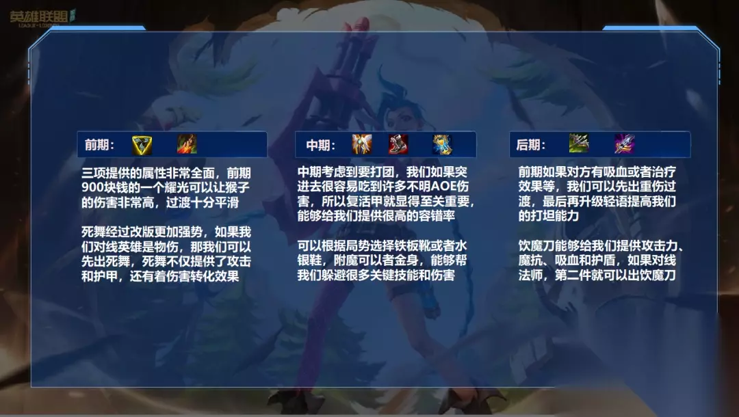 首先我们来看看猴子的优点:猴子在装备成型后拥有极高的爆发力。他们甚至不用大招就能快速杀死软弱的英雄。而且,它们的灵活性很强,可以利用假体来骗取很多技能。如果队伍缺少前排,猴子也可以改变出装思路,把自己变成自己队伍的前排坦克。猴子可以说是多才多艺。 英雄简析