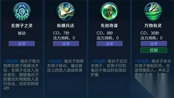 纵横兵法:鬼谷子指挥玄微子移动,撞击路径上的敌人造成伤害(技能有BUG,无法测试) 先知奇谋:鬼谷子召回玄微子,玄微子回到鬼谷子身边时添加护盾