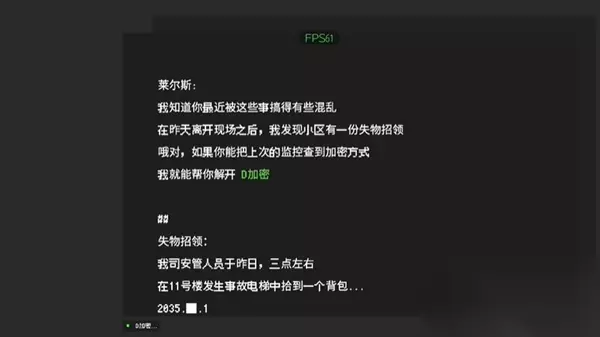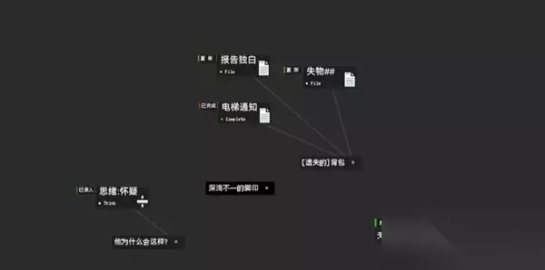 二、第二章困境通关攻略 1、浅层记忆:单击线索【一封信件】和【电梯维修】展开调查,发现线索【[遗失的]背包】和【被困在电梯里的人】。 2、深层记忆:将两个线索中的其中一个与【电梯通知】连接,得到线索【深浅不一的脚印】和【无法解码的监控视频】。 3、将线索【无法解码的监控视频】与【思绪】链接,切换到【观察】或【思索】。 4、浅层记忆,将【含有字母D的加密密码】和【信件】连接,解码后得到线索【视频监控】。