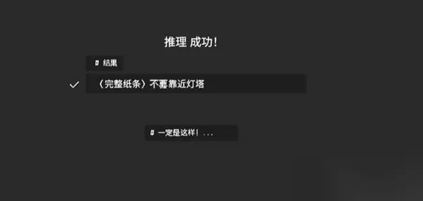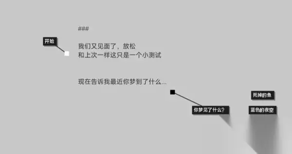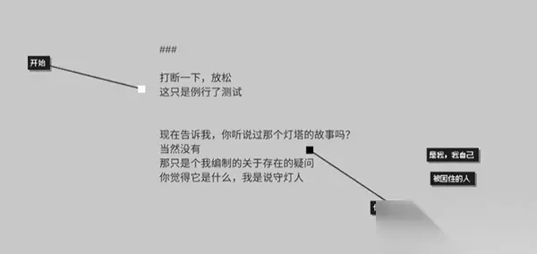 10、将【不要靠近灯塔】和【奇怪的评估记录】与【警方通报】相连接,触摸【黑石】【第三次出现】,【白石】出现第二次。 11、【白石】02: C338笔记:一二两项【不变】,【或许只是个疯子】【解锁:2-3】。 观测记录R2:两项【不变】。 测试: 【死掉的鱼】【理智:-0.1,解锁:N-3】。 【蓝色的夜空】【理智+0.1,解锁:N-1】。 【黑色的方块】【理智:-0.2,解锁:N-2】。 没什么进展:两项【不变】。