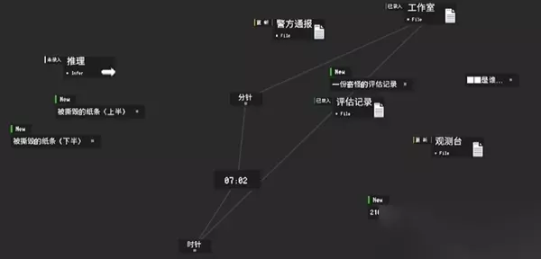 6、调查【评估记录】,获得线索【奇怪的评估记录】。 7、深层记忆,【观测记录】,调整时钟至【10:00】,切浅层记忆,点击工作室,得到线索【上半张纸条】和【210记录】。 8、深层记忆,调到【2:00】,通过【观测台】获得【C338】时间是【7:02】,切浅层记忆,调到这个时间。 9、获得线索【下半张纸条】,使用【上下纸条】连接【推理】,获得线索【不要靠近灯塔】。