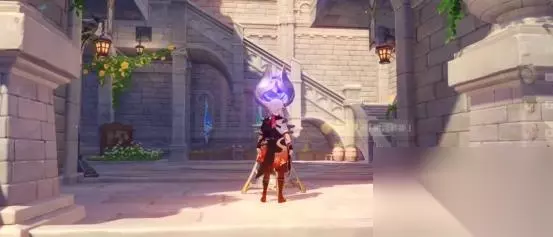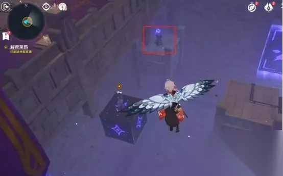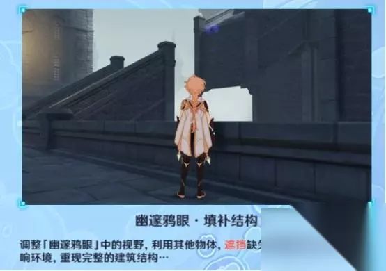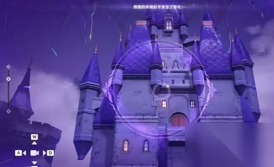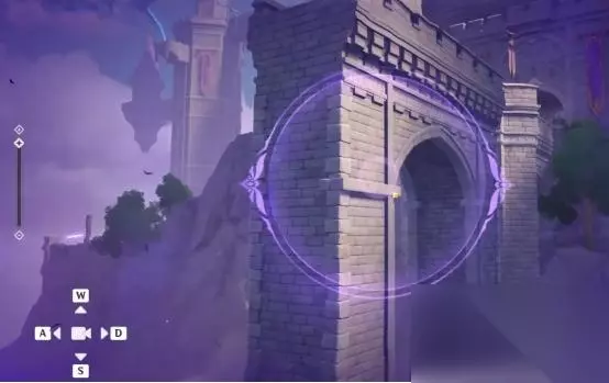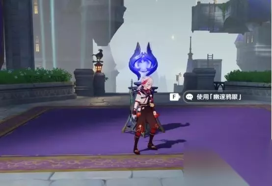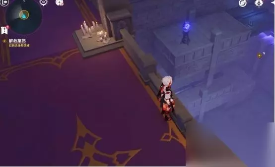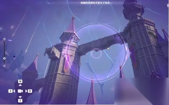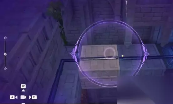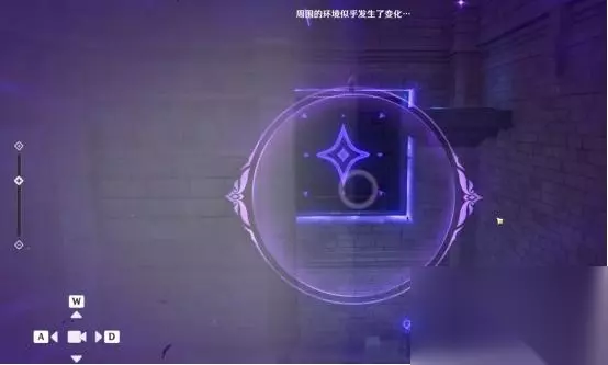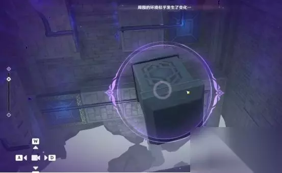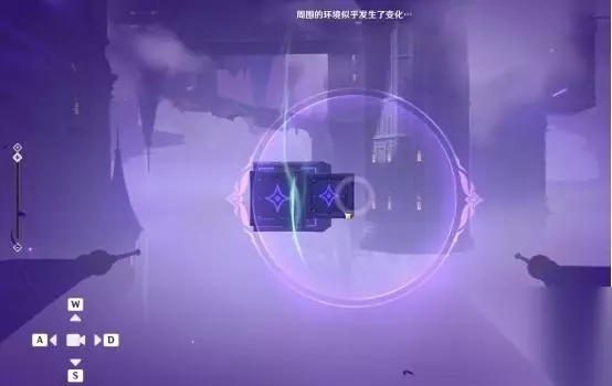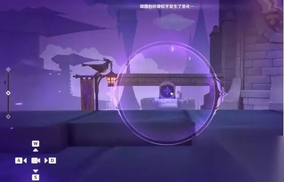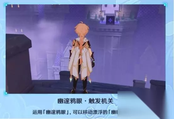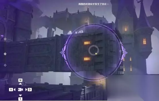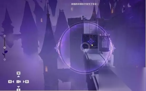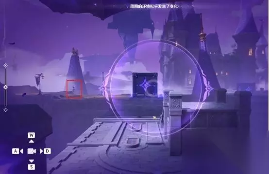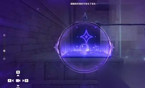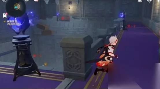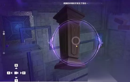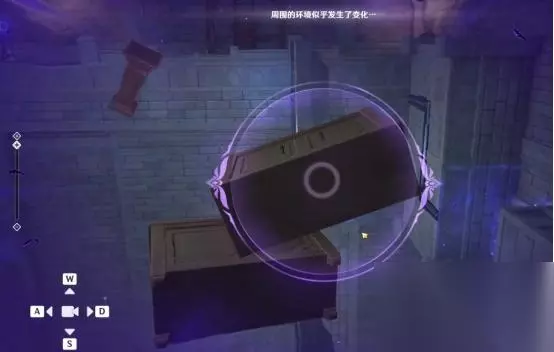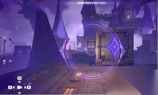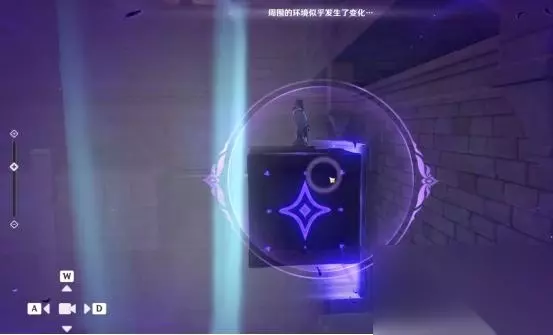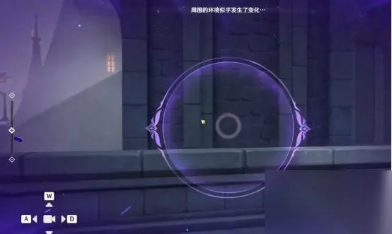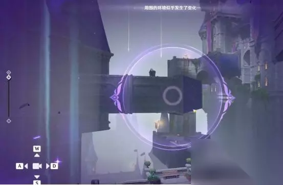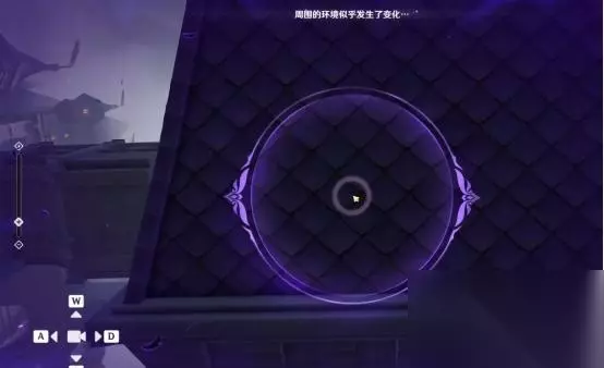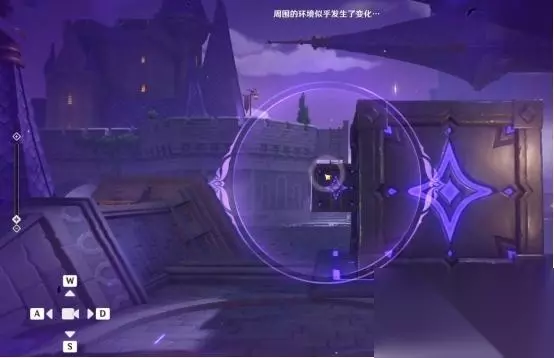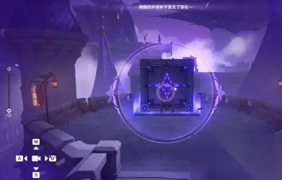 1、第一处 在秘境入口左手边我们会看到第一个幽邃鸦眼,互动后讲目标调整至如图位置,会看到屏幕上方的字变成“周围的环境似乎发生了变化···”并且屏幕上出现紫光,就表示此机关解密成功。