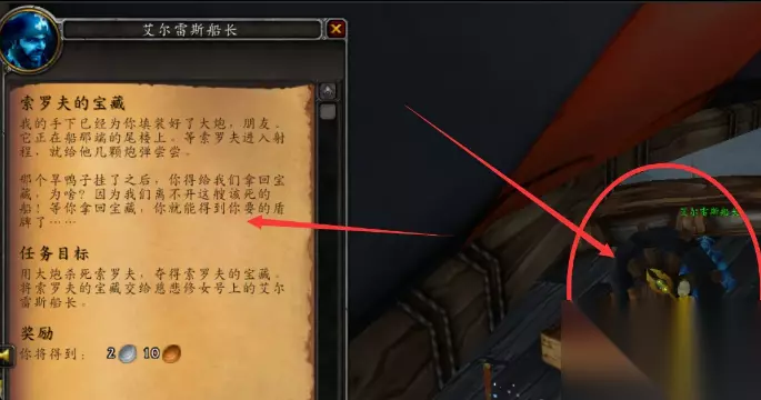 任务流程: *首先,你需要在慈悲修女号上找到艾尔雷斯船长并接取任务。 *船长会告知你,他已经为你准备好了大炮,它位于船的尾楼上。 *等待索罗夫进入大炮的射程,然后利用大炮攻击并击杀他。 *获取索罗夫的宝藏,并将其带回给艾尔雷斯船长。 任务描述: 艾尔雷斯船长说:“我的手下已经为你准备好了大炮,朋友。一旦索罗夫进入我们的射程,立即对其进行炮击。成功击杀索罗夫后,你必须为我们带回他的宝藏。这是为何?因为我们的船离不开这里!完成这个任务后,你将得到你梦寐以求的盾牌。” 任务奖励: 完成任务后,满级玩家将获得1金币80银币的奖励,未满级玩家将获得15100点经验和150点卡鲁亚克声望点数。除此之外,还有可能会获得其他珍贵物品或奖励。 具体任务步骤: 1、在嚎风峡湾的艾尔雷斯船长处接到【索罗夫的宝藏】任务。